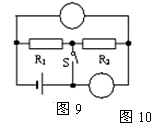 13.如图9所示,当开关S闭合后,要使电阻R1、R2并联,请在圆圈内填入适合的电表
