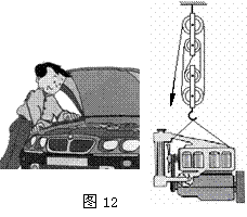 (10分)近年来,汽车逐步走进了普通百姓的家庭.汽车出现故障后,需要进行维修.小明家的汽车发动机在维修时,工人师傅要用一个滑轮组(如图12)把车里的发动机提起来.已知发动机质量为120kg,工人拉力为400N,在10s内发动机被提起了1m.求:(g取10N/kg)