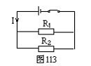 98.在图113所示的电路中,电阻R1的阻值是5欧姆,干路中的电流强度I是0.5安培,电阻R2两端的电压是2伏特。求: