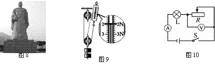 19.用滑轮组将一个重为5N的物体匀速提升10cm,由图9可知,绳端受到的拉力F为 N,绳端移动的距离s为 cm,滑轮组的机械效率η为 。