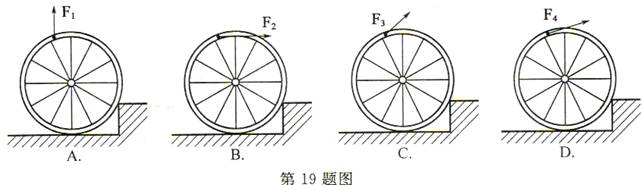 19.在海南举办的大力士比赛中,有一个项目是把车轮推上台阶。下面把车轮推上台阶的四种方法,推力的作用点相同,推力的方向不同,如图所示,则哪一种推法最省力