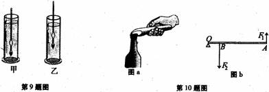 9.密度计是用来测量液体密度的仪器,测量时漂浮在被测液体中。如图,用同一支密度计分别测量甲、乙两种液体的密度,则密度计在两种液体里受到的浮力大小F甲 F乙,两种液体的密度ρ甲 ρ乙。(均填“>”、“=”或“<”)