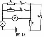21.某科技小组的同学们设计制作了一个多档位电热器模型,为了分析接入电路的电阻对电热器电功率的影响,他们将电表接入电路中,如图12所示。当只闭合开关S1时,电压表和电流表的示数分别为U1和I1,电阻R3消耗的电功率为P3;当只闭合开关S2时,电压表和电流表的示数分别为U2和I2,电阻R3消耗的电功率为P′3,并测得此时R2消耗的电功率的电功率为1.6W,已知U2=2U1,P3=4P′3,(电源电压、电阻保持不变)
