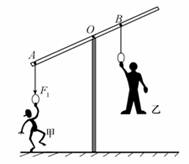 (09泰安)两位同学利用左下图所示的可以绕O点自由转动的健身器材进行锻炼,甲同学竖直向下用力F1将另一端的乙同学拉起。请画出拉力F1的力臂L1。