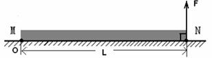 (09兰州). 一块质量分布均匀的长方形木板放在水平地面上,现在要将木板从N端抬起,请你在图中标出支点O的位置,并画出所用最小动力F的示意图和动力臂L(板的厚度不计)。