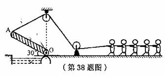 (09湖州)38 .古代护城河上有座吊桥,它的结构原理如.图所示。把桥面看成是长为10 米,所受重力为3000牛的均匀杆OA ,可以绕转轴O 点在竖直平面内转动,在O 点正上方10 米处固定一个定滑轮,绳子通过定滑轮与杆的另一端A 相连,用力拉动绳子就可以将杆从水平位置缓慢向上拉起。杆即将离开水平位置时,绳子的拉力为F1 。当士兵们把吊桥拉起到与水平面的夹角为300 时,绳子的拉力为F2,所用的时间是0.5 分钟(忽略绳子重力、滑轮半径和摩擦),则: