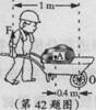 42.(2分)建筑工地上,工人用独轮车运送石块如图所示,石块与独轮车的总重为600 N.重心在A点,则工人两手对车所施加向上的力F是______N;要想使F更小一些,你的建议是_____________