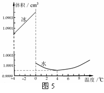 某研究人员为了探究冰和水的体积与温度的关系,在一定的环境下将1g的冰加热,分别记录其温度和体积,得到了如图5所示的图象。请你观察此图象回答下列问题: