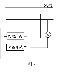 19.楼道里声光控开关的工作特点是:白天光控开关是断开的,晚上是闭合的;声控开关有声音时是闭合的,没声音时是断开的。请在图9中连接好开关电路,使其能合乎实际要求。