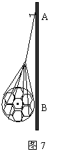 17.在光滑墙壁上用网兜把足球挂在A点,足球与墙壁的接触点为B。在图7中画出球受到的重力G、悬绳对球的拉力F的示意图。