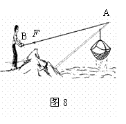 18.渔夫用绳子通过竹杠拉起渔网,如图8所示,请在图上画出绳子AB段对杆拉力F的力臂L。