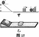 图17所示,甲是探究“动能的大小与什么因素有关”的实验装置,实验中让同一钢球从斜面上不同的高度由静止滚下,碰到同一木块上.乙是探究“阻力对物体运动的影响”的实验装置,实验中让同一小车从斜面上相同的高度由静止滑下,在粗糙程度不同的水平面上运动.请回答下列问题: