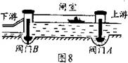 16.三峡船闸是世界上最大的人造连通器。图8是轮船通过船闸的示意图.此时上游阀门A打开,下游阀门B关闭.下列说法正确的是