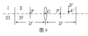如图9所示,F为凸透镜的两个焦点,A'B'为物体AB的像,则物体AB在 [ ]