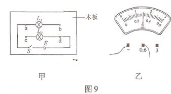 (2)小丽在电源和开关之间串联接入电流表,闭合开关,两灯亮,电流表示数如图9乙所示,可初步判断通过灯厶的电流可能是____________A,也可能是___________A。