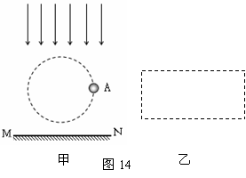 30、如图14甲所示,一束平行太阳光垂直水平地面MN射下,A为小铁球。⑴标出小铁球A在甲图中位置时,其影子A′在地面MN上的位置(用点表示即可);⑵若小球在竖直平面内沿图中圆形虚线轨迹运动,请在图乙框中画出小球的影子在地面上运动的轨迹。