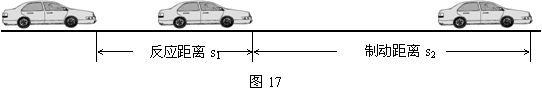 33、汽车追尾是高速公路上常发生的交通事故,其重要原因是遇到意外情况时不能立即停车。研究发现,司机从看到情况到踩刹车需要一段时间,这段时间叫反应时间;在反应时间内汽车要保持原速前进一段距离,这段距离叫反应距离;从踩刹车到车停止,汽车还要前进一段距离,这段距离叫制动距离。如图17所示。