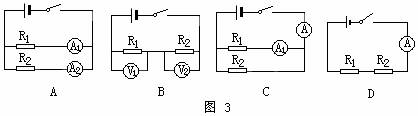 8.(09茂名)现有两个阻值不等的未知电阻R1和R2,为了分辨它们的阻值大小,几个同学分别设计了如图3所示的四种电路,其中可行的是