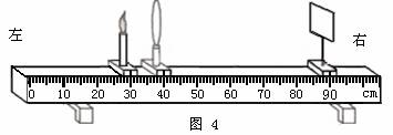 9.(09茂名)如图4所示为小明做“探究凸透镜成像规律” 的实验装置图。透镜的焦距为15cm,要使蜡烛在光屏上成清晰的像,在蜡烛、凸透镜和光屏三者中,只移动其中的一个,其余两个不动,下列措施中可行的是