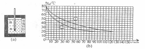 (4分)25、小黄同学做“比较两种材料保温性能”的实验,他取泡沫塑料①和卫生纸②两种作保温材料,两根相同的温度计,两个相同的大玻璃烧杯,钟表和热开水,以及细线、硬纸片、剪刀做两个相同的硬纸外壳,其中一个装置如图(a)所示,根据实验测得的数据绘得图(b)所示“水温与时间关系”的图象,实验过程室温基本不变,请回答: