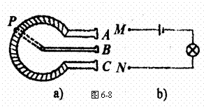 (2分)如图6-8所示,为某种调光型台灯中使用的电位器示意图,P为旋片可随转动旋钮改变在碳膜上的位置,A、B分别连在碳膜两端。以笔画线将a图连在b图所示电路中,要求顺时针转动旋钮可使灯泡亮度增加,则导线应怎样连接?(已知a图中虚线所示为旋钮)。