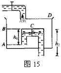 27. 如图15所示的是一种公厕自动冲洗水箱的装置。水箱内装有一个倒放的L型管子,此管子通过箱底与排水管相连。当水箱内水位到达图中的哪点时,排水管开始大量排水?