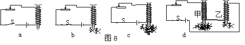 用漆包线(表面涂有绝缘漆的导线)在大铁钉上绕制若干圈,制成简单的电磁铁.图8所示的a、b、c、d为实验中观察到的四种情况.