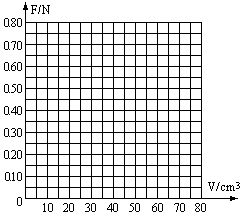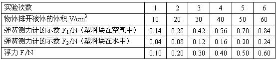 (2008年大连市)小明猜想“浮力大小F与液体的密度ρ和物体排开液体的体积V有关”,他为了探究F与V的关系,自制了6个塑料块(密度大于水),其体积分别为10cm3、20 cm3、30 cm3、40 cm3、50 cm3、60 cm3,将各塑料块分别挂在弹簧测力计上,记下各塑料块在空气中和完全浸没在水中时弹簧测力计的示数。