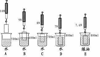 (2007年广东省汕头)小明同学用一个弹簧测力计、一个金属块、两个相同的烧杯(分别装有一定量的水和煤油),对浸在液体中的物体所受的浮力进行了探究.下图表示探究过程及有关数据.