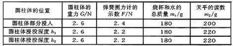 ③如图所示,将圆柱体部分浸入烧杯的水中,静止在某一深度,记下弹簧测力计的示数 F,则圆柱体所受水的浮力为 (用弹簧测力计所测得的量来表示);此时向天平的右盘加上适量的砝码,使天平重新平衡,记下天平的读数m2,则圆柱体对水的压力为__________________ (用天平所测得的量来表示)。