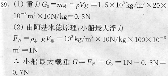 (05中)39.(5分)伍实同学利用密度为1.5×103kg/m3的橡皮泥进行造“船”比赛,他所用橡皮泥的体积为20cm3,造成的小船最大排水体积为100cm3.求: