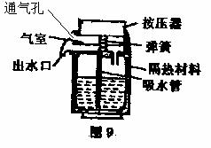 (03调)19·一种按压取水式热水器如图9所示,当按下按压器时;通气孔被封闭,气室与瓶