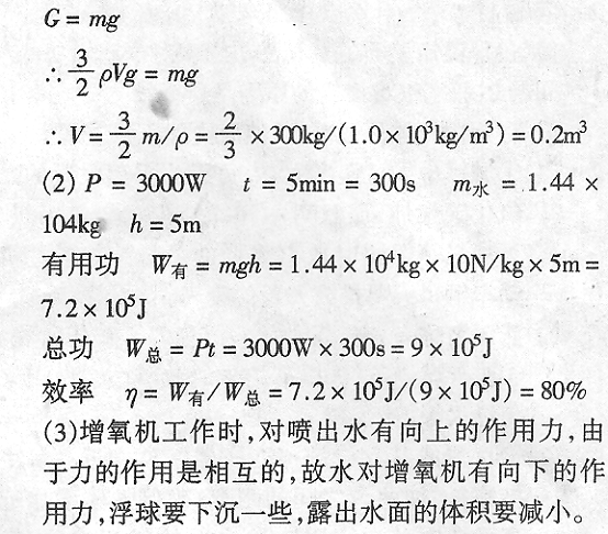 (3)增氧机工作时,试分析浮球漏出水面的体积有何变化?(不计算,只作答)