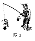 15.如图3所示,用钓鱼杆钓鱼时候,鱼钩已经钩住了鱼,鱼还在水中时,感觉鱼很轻,刚把鱼从水中拉离水面就感觉鱼变“重”了,对钓鱼过程的下列几种解释,错误的是
