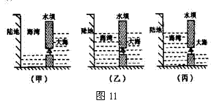 如图11所示是利用潮汐发电的原理图。左方为陆地和海湾,中间为水坝,其下有通道,无论涨潮或落潮,水流经过通道均可带动发电机发电。一昼夜中两次涨、落潮,四次发电。涨潮时,堵住通道,潮水涨至最高水位时打开通道,进水发电,如图11甲所示;当海湾水位涨至最高时,堵住通道,如图11乙所示;落潮至最低水位时,打开通道放水发电,如图11丙所示。(取g=10N/kg,海水的密度1.0×103kg/m3)