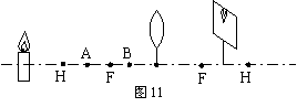 4、(2008湖北荆门)小芳同学实验探究凸透镜成像的规律,她首先按图11所示完成仪器装配,图中H点是2倍焦距处。经过调节,在光屏上得到了一个清晰的像,但像的位置偏高,为了使像能成在光屏的中央,应把蜡烛向______(选填“上”或“下”)调;调节好蜡烛的高度后,她把蜡烛移到A点处,此时光屏上的像很模糊,为了得到清晰的像,应把光屏向______移动(填“左”或“右”),这次成的是倒立、________的实像。