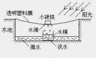 身处偏远海岛,按如图所示方法可获取少量的淡水。阳光的照射使池内海水加快 ,形成水蒸气;水蒸气在塑料膜上 形成小水滴;塑料膜下表面结成的水滴受 力的作用滑到最低处后滴入水桶中,可得到淡水。