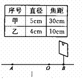 1.在做“探究凸透镜成像规律”实验时,实验桌上有两个凸透镜,规格如图右表所示,光具座上标尺的刻度范围是0-90cm。实验中选用 凸透镜,较好(选填“甲”或“乙”)。选好器材后,依次将点燃的蜡烛、凸透镜、光屏放在光具座上的A、O、B位置,在光屏上得到清晰的烛焰的像,如图所示:
