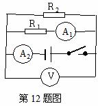 (07中)12.如图电路中,R1=10Ω、R2=20Ω,开关闭合后,电压表示数为6V,则A1的示数是_________A,A2的示数是__________A。5min R1消耗的电能___________J;