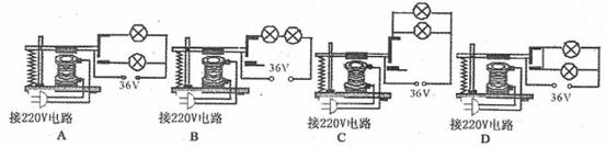 (09调)27. 小利同学观察到学校楼道里的消防应急灯,平时灯是熄的,一旦停电,两盏标有“36V”灯泡就会发光。以下是小利设计的四个电路,其中可以起到消防应急灯作用的电路是![]()