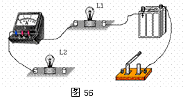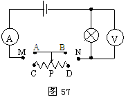 57、将图57中的滑动变阻器接入电路中。使变阻器滑片P向右滑动时,电流表和电压表的