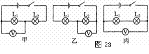 在探究“串联电路各电压的关系”时,吴强小组的同学分别按图23甲、乙、丙三个测量电路进行了正确的测量,测量结果U1、U2、U如表所示。
