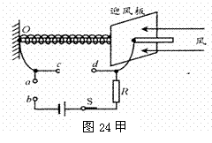 13、(09成都)小明、小亮和小敏共同设计了一种测定水平方向风力的装置。其原理如图24(甲)所示:绝缘轻弹簧的左端固定在D点,右端与中心有孔、表面竖直的金属迎风板相连,一起套在左端也固定在O点的粗细均匀、电阻随长度均匀变化,且水平放置的金属杆上,迎风板与金属杆接触良好;电路中左端导线与金属杆的左端相连,右端导线连接在迎风板上并可随迎风板移动,R是定值电阻,a、b、c、d为四个接线柱。