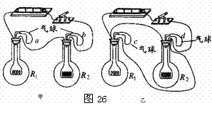 16、为了探究电流产生的热量跟什么因素有关系,王军设计了如图26所示的甲、乙两装置。他将两段阻值不同的电阻丝(R1<R2)分别密封在两个完全相同的烧杯中,并通过短玻璃管与相同的气球相连,两次实验电源电压不变。