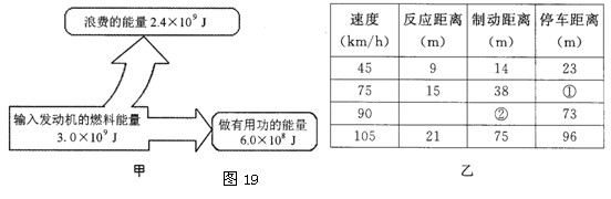 (1)普通汽车行驶时,发动机将燃料燃烧产生的内能变为机械能。图19甲是某型号的普通汽 车发动机的能量流向图,请依据图19中提供的信息,计算该汽车发动机的效率。为提高该类汽车发动机的效率,请提出一种合理的设想。