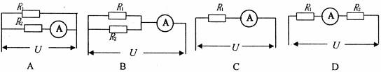 11.如图所示的四个电路中,电压U都相等,并且电阻R1>R2,电流表示数最小的是( )