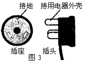 4. (龙岩市) 洗衣机、电冰箱、电脑等许多家用电器均使用三脚插头与电源插座连接,如图3所示。细