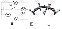 8.(南京六中)在如图6甲所示电路中,当闭合开关后,两个电压表指针偏转均为上图6乙所示,则电灯L1和L2两端的电压分别为