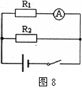 10. (南京六中)如图8所示电路中,R1=20Ω,电流表示数为0.3A,总电流为0.5A,则通过R2的电流及电阻R2的阻值分别为