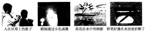 解析:本题将生活中常见的光学现象放在一起让同学们辨别,要求同学们熟悉光的直线传播及其在生活中的应用,及光的反射和光的折射知识的应用.影子和小孔成像是光的有线传播形成的,荷花在水中的倒影是由光的反射形成的虚像.铅笔好像折断了是光的折射形成的虚像.
